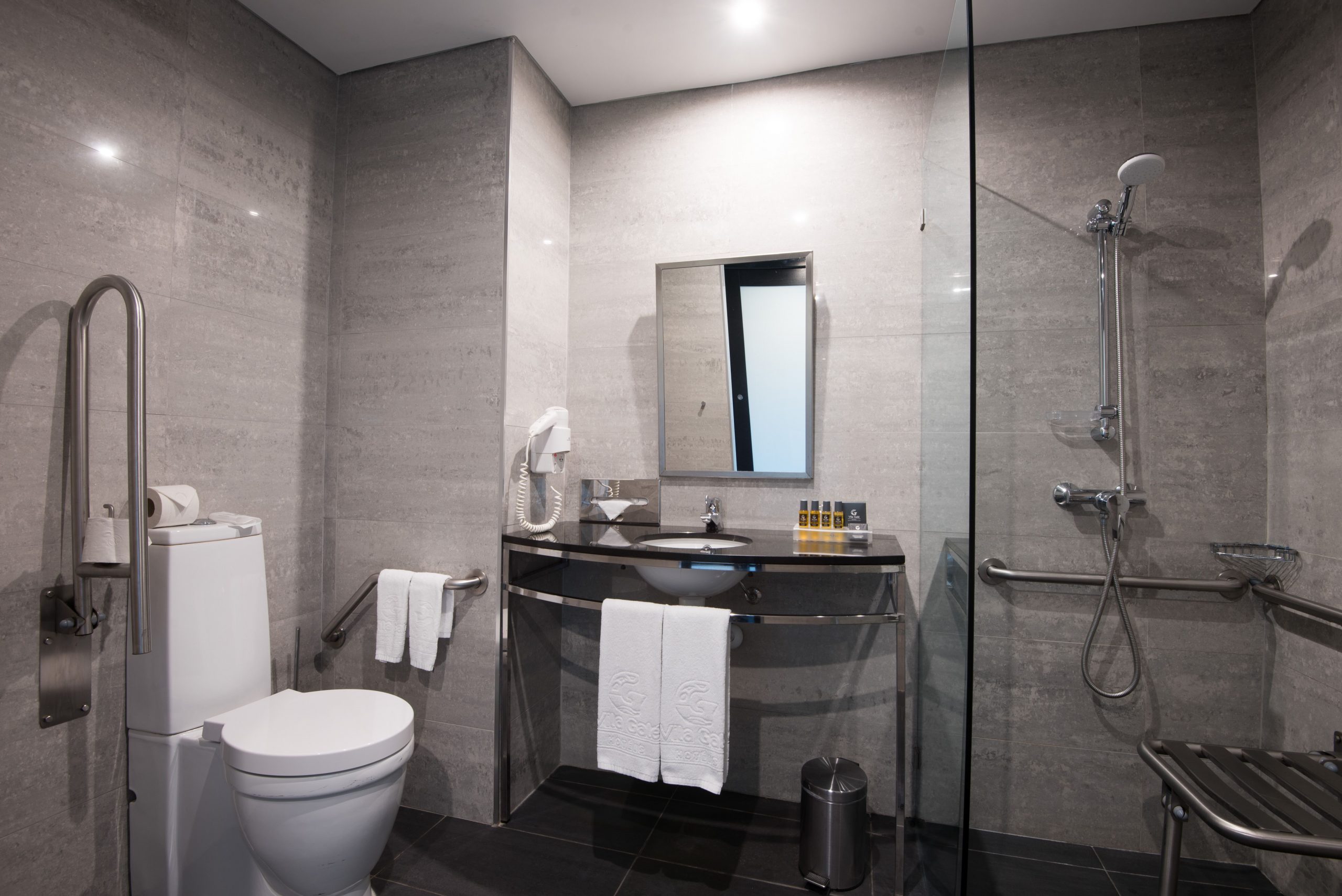 Toilet med foldbart greb og vægmonteret badestol i bad. Hotellet har 112 standard værelser med havudsigt og 18 junior suiter . To værelser er tilpasset til bevægelseshæmmede. på værelset finder du Telefon, gratis wifi, Aircondition, tv LCD, Kabelkanaler, Minibar, Sikkerhedsboks, Privat badeværelse med telefon, Hårtørrer, make-up spejl, Gratis toiletartikler, Elektronisk sikkerhedslås, Roomservice døgnet rundt